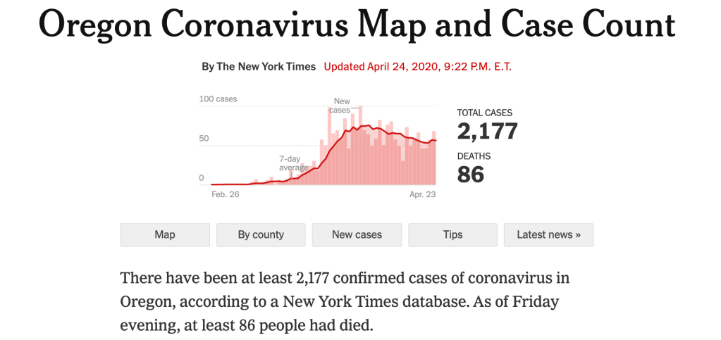 From the first case of COVID-19 that occurred in my county, to today, we’ve seen a rapid increase of cases in Oregon. As of today, Oregon has had 2,177 cases and 86 deaths, and this graph shows how rapid of an increase we’ve faced over the past two months (New York Times).