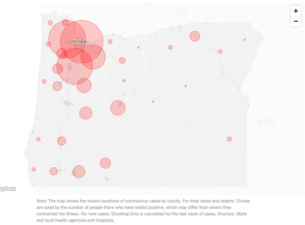 This map shows how prominent COVID-19 is in the county that I live in. I live in Beaverton, which is about 15 minutes away from Downtown Portland. As you can see, there are cases spread out all around the state, yet the biggest circles are found in Portland (New York Times).